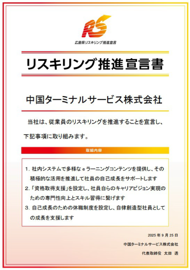 中国ターミナルサービスでは、社員一人ひとりの成長を促し、今後必要となるスキルの変化にも対応できる人財を育成するため、広島県リスキリング推進宣言制度に基づき「リスキリング推進宣言書」を策定しました。
